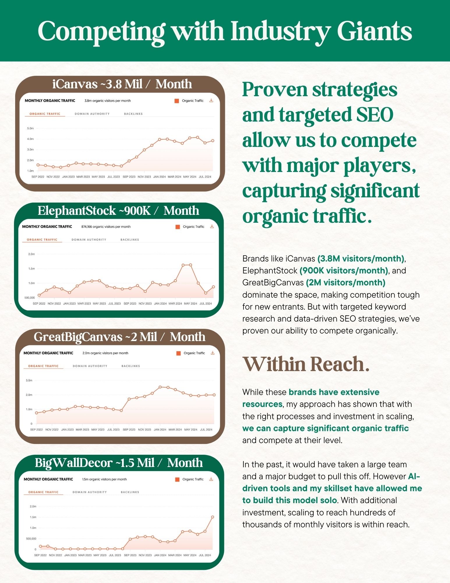 This project involved developing a pitch deck aimed at attracting investors through detailed market research and performance analytics. The deck showcased key market drivers and revenue opportunities in the online art space, focusing on brand scalability. It demonstrated growth potential with metrics on SEO growth, keyword ranking, and marketplace performance.