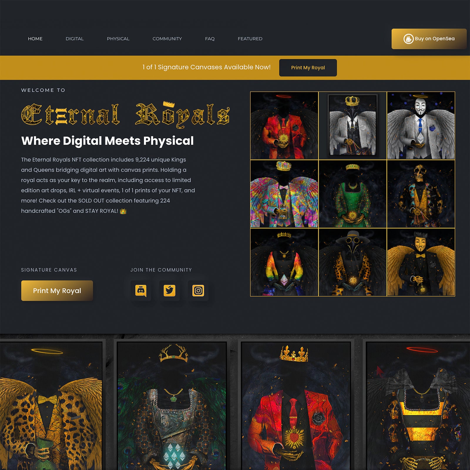 The Eternal Royals NFT collection includes 9,224 unique Kings and Queens bridging digital art with canvas prints. Holding a royal acts as your key to the realm, including access to limited edition art drops, IRL + virtual events, 1 of 1 prints of your NFT.
