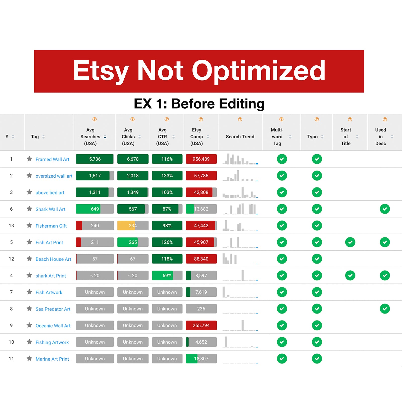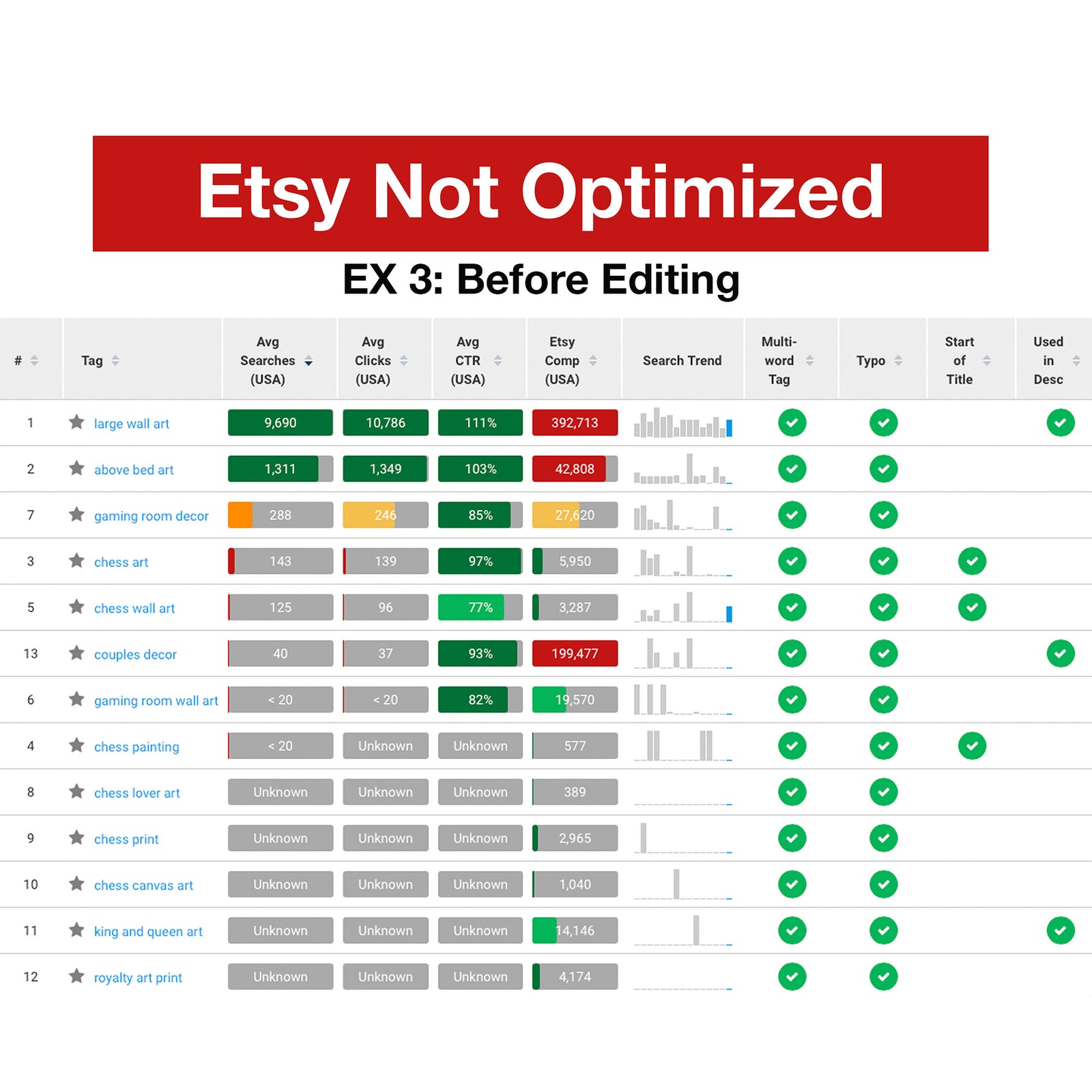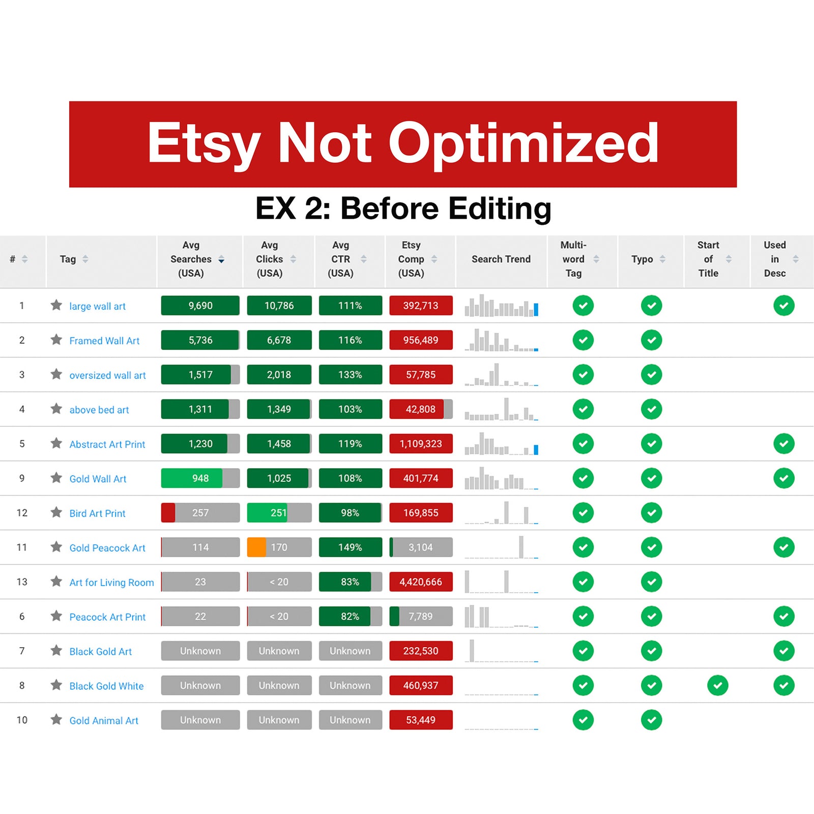 In an effort to increase organic rankings in Etsy, I optimized low-quality titles, tags, and descriptions for a store specializing in art.