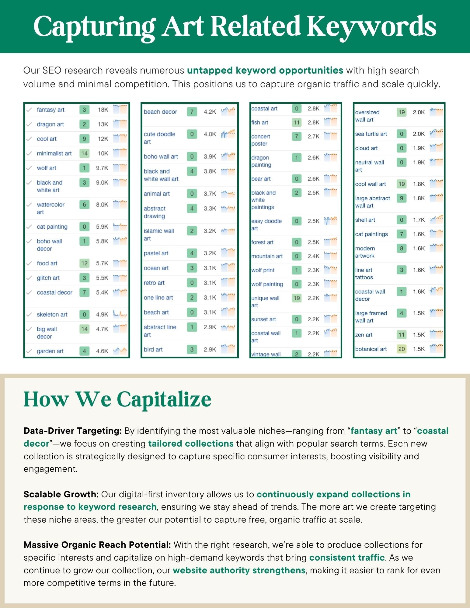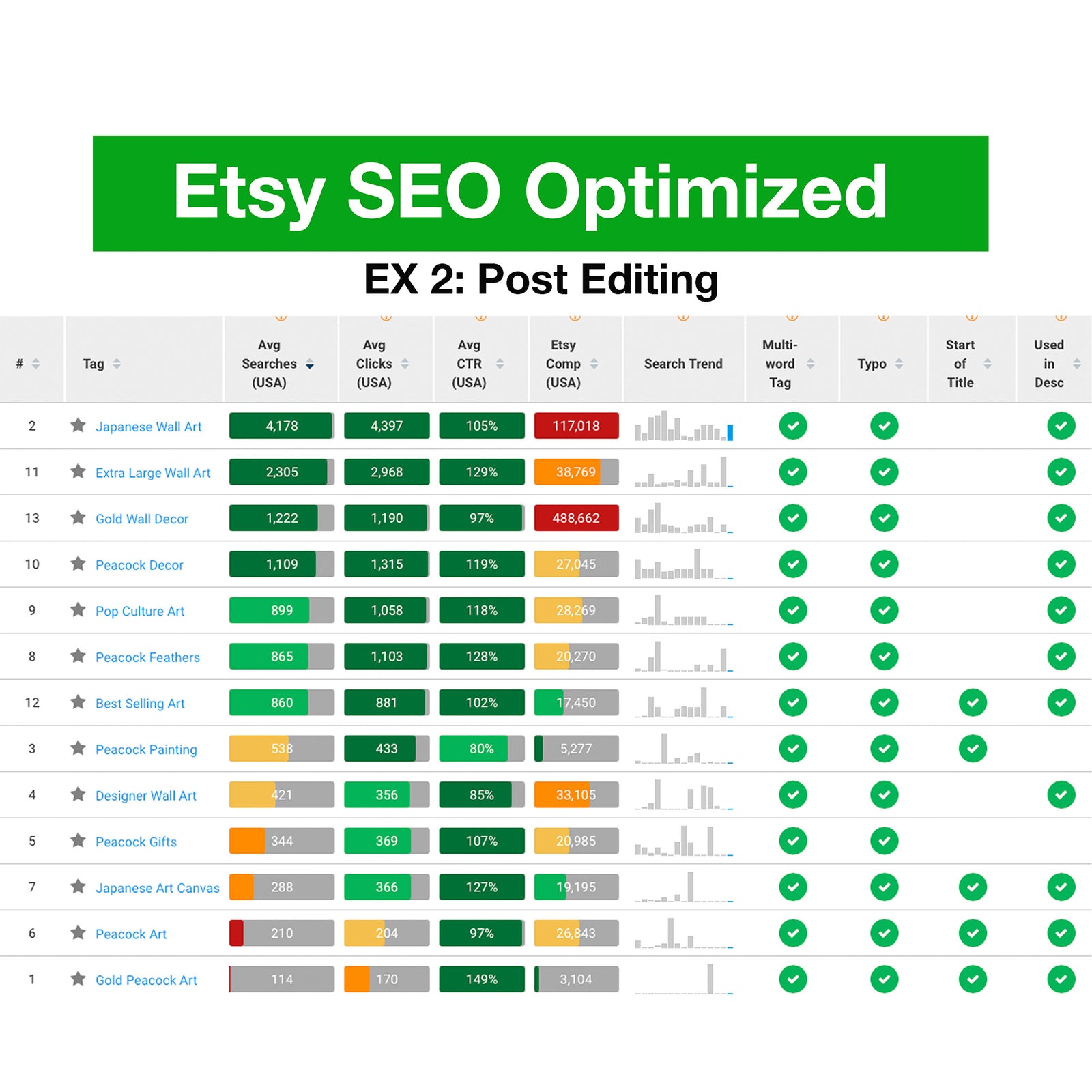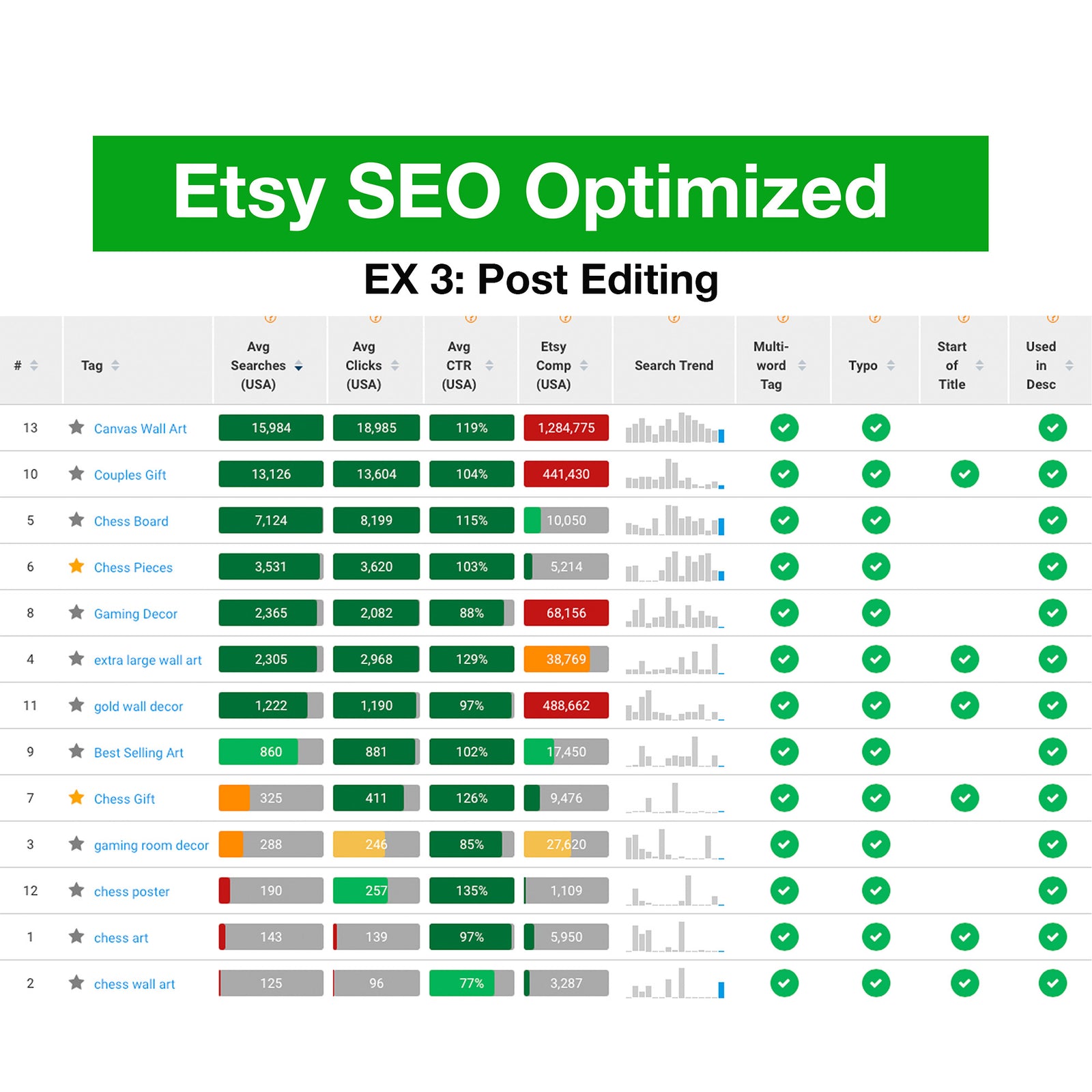 In an effort to increase organic rankings in Etsy, I optimized low-quality titles, tags, and descriptions for a store specializing in art.